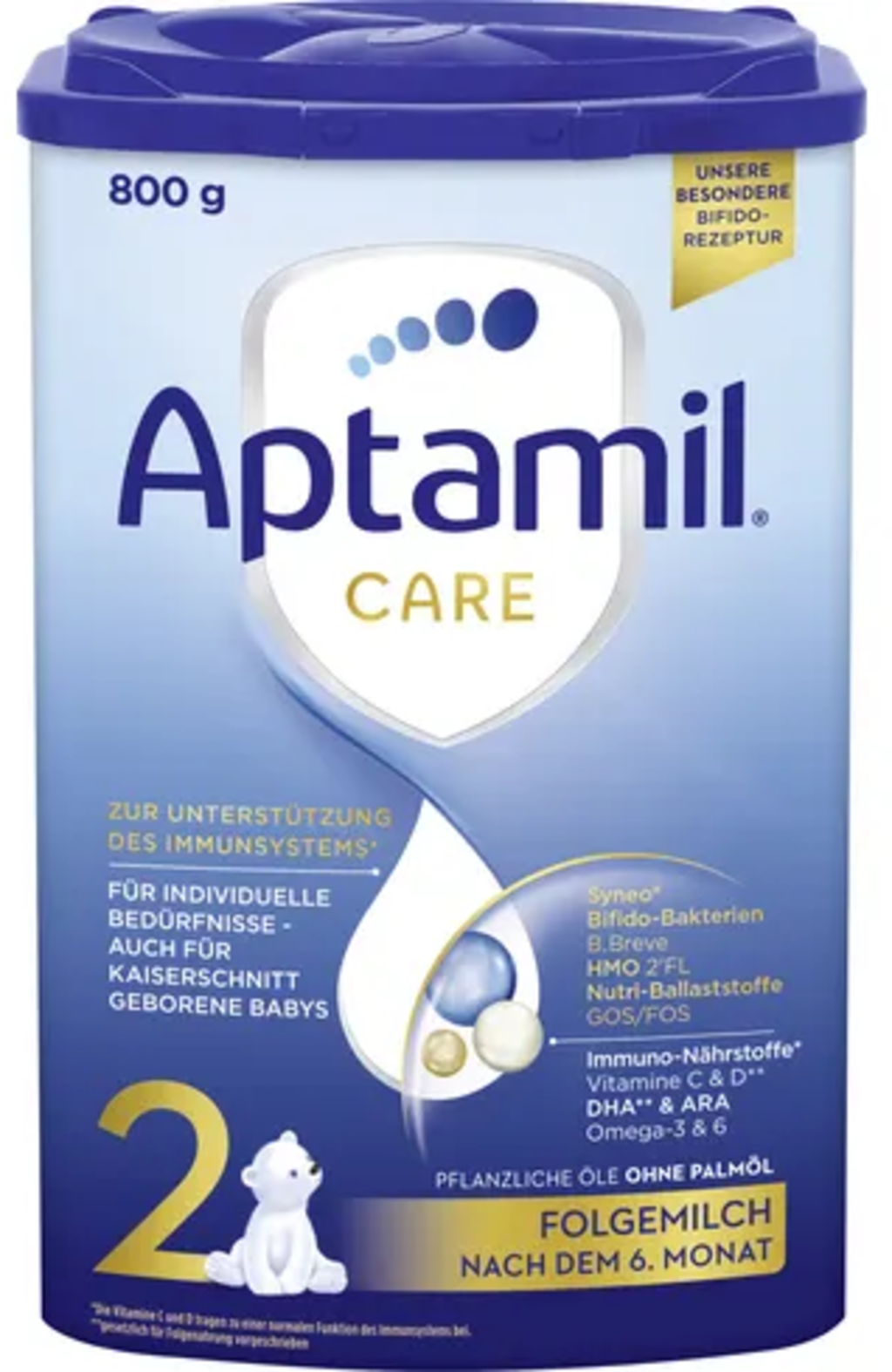 Nota sulla formula di proseguimento Aptamil CARE 2: l'allattamento esclusivo al seno per i primi 6 mesi è l'ideale per il tuo bambino. Come ogni formula di proseguimento, anche la formula di proseguimento CARE 2 di Aptamil non deve essere utilizzata come sostituto del latte materno nei primi 6 mesi, ma solo dopo il 6° mese nell'ambito di una dieta mista.