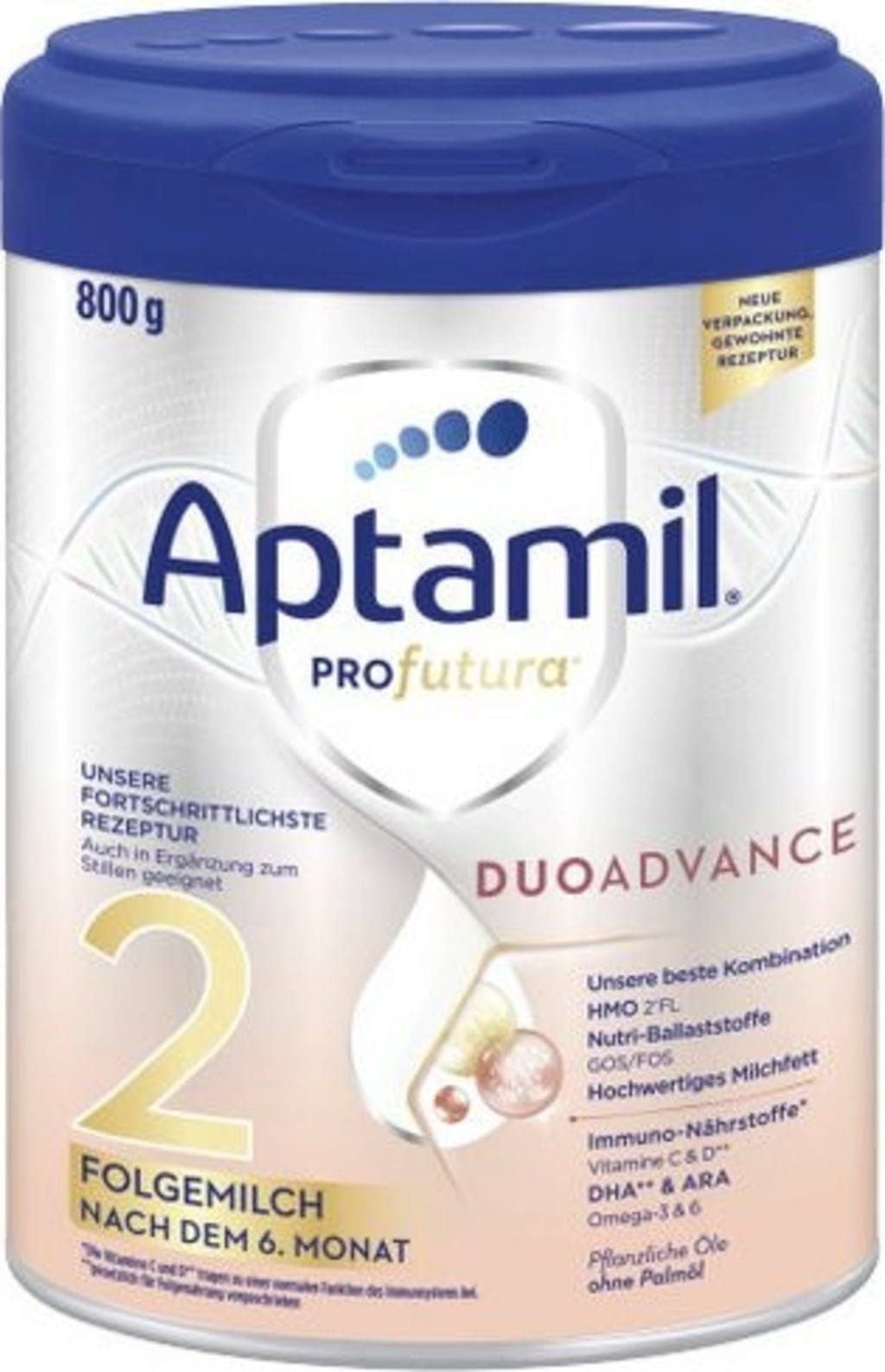 La formula di proseguimento Aptamil Profutura DUOAdvance contiene una formula brevettata di nutrienti preziosi, come vitamine, acidi grassi omega-3 e omega-6 e batteri lattici naturali. Contiene inoltre oligosaccaridi del latte umano (HMO), che si trovano anche nel latte materno.