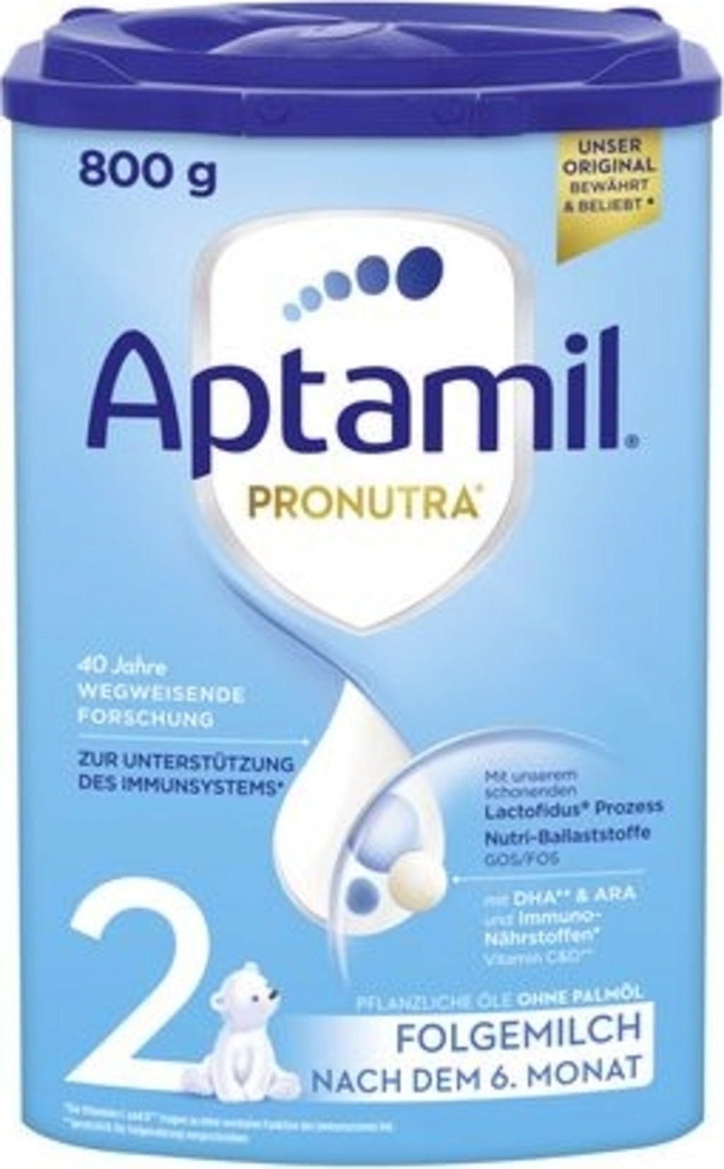 Dopo il 6° mese di vita molti bambini hanno già iniziato la fase di svezzamento e quindi alcuni pasti a base di latte vengono sostituiti con le pappe. Aptamil Pronutra 2 è una formula di proseguimento adatta a questa fase della vita. La ricetta senza olio di palma e amido contiene molti importanti nutrienti e vitamine adatti all'età del bambino.