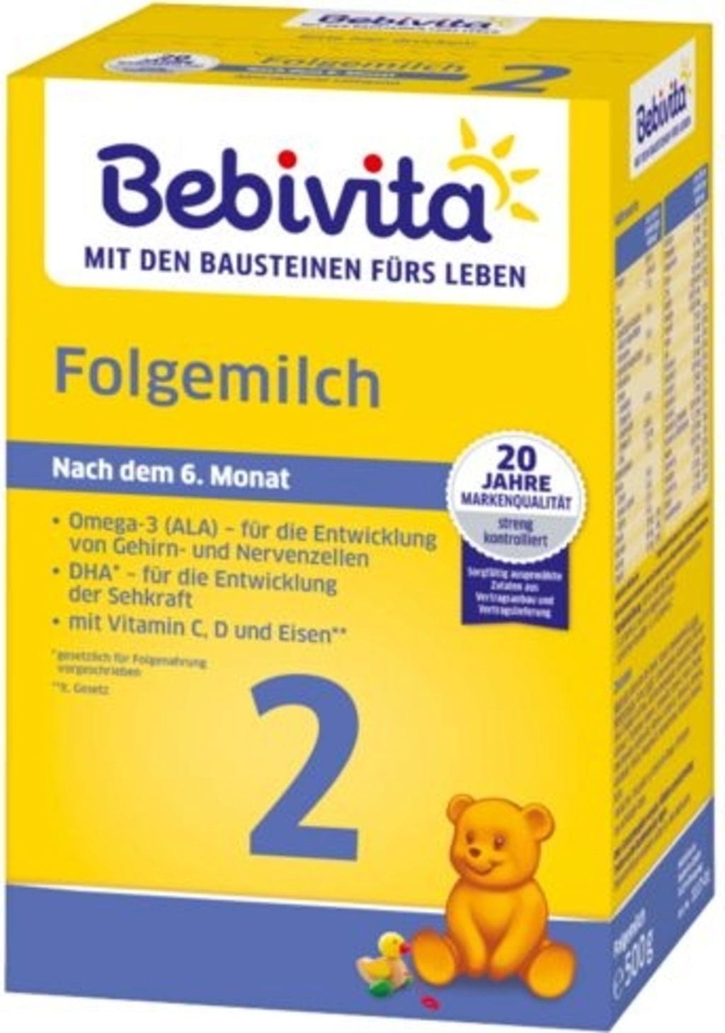 La formula di proseguimento Bebivita a base di latte vaccino 2 è stata sviluppato appositamente per l'allattamento al biberon nell'ambito di una dieta complementare equilibrata. Ciò significa che non deve essere somministrata come sostituto del latte materno (unico alimento o come integratore) durante i primi mesi di vita, ma solo a partire dal 7° mese di vita. La ricetta è studiata appositamente per le esigenze di questa età e garantisce un senso di sazietà adeguato.