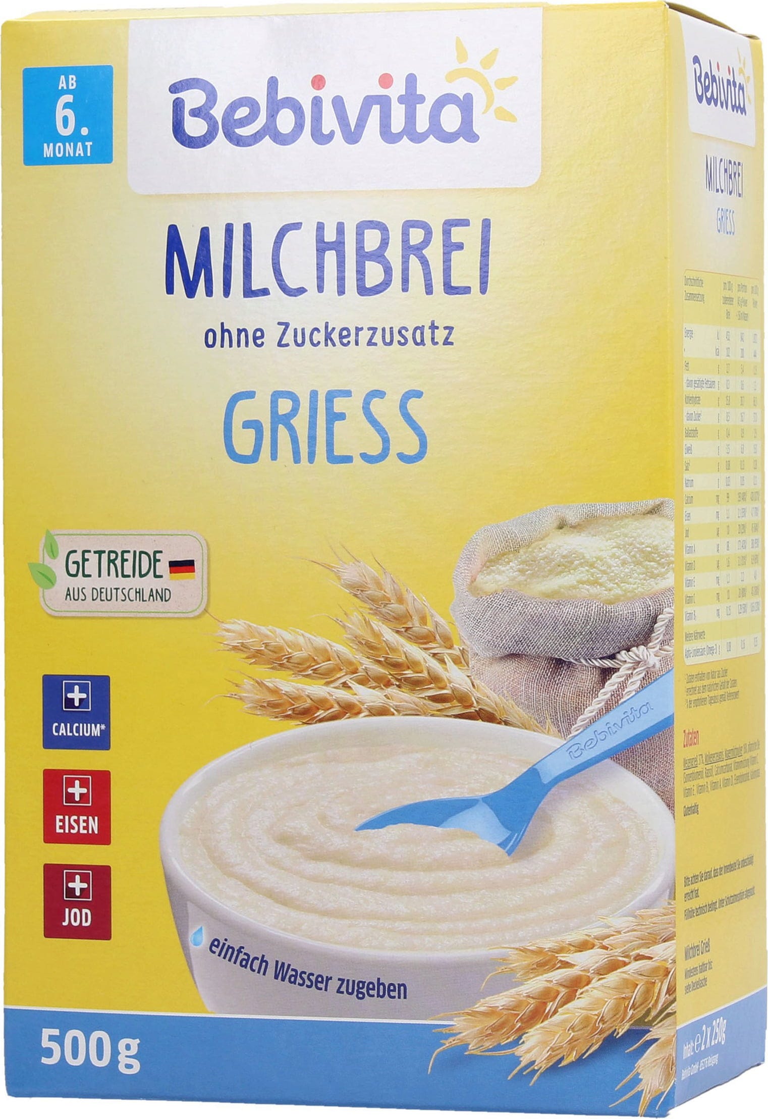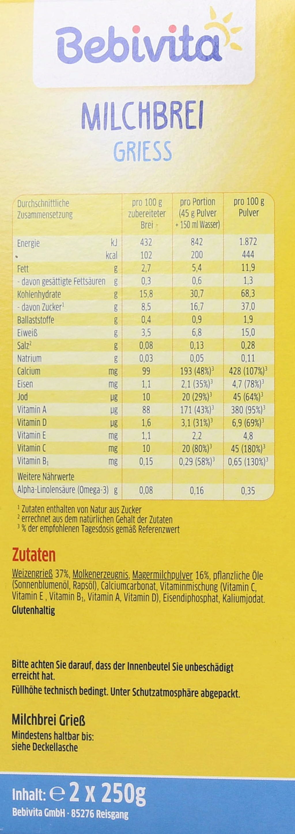 Durante il periodo dello svezzamento il bambino inizia ad interessarsi a gusti e consistenze diverse. La pappa lattea Bebivita di semolino è appositamente formulata per le esigenze del bambino a partire dal 6° mese. Il semolino ha un buon potere saziante e fornisce al bambino energia, vitamine e sostanze nutritive.