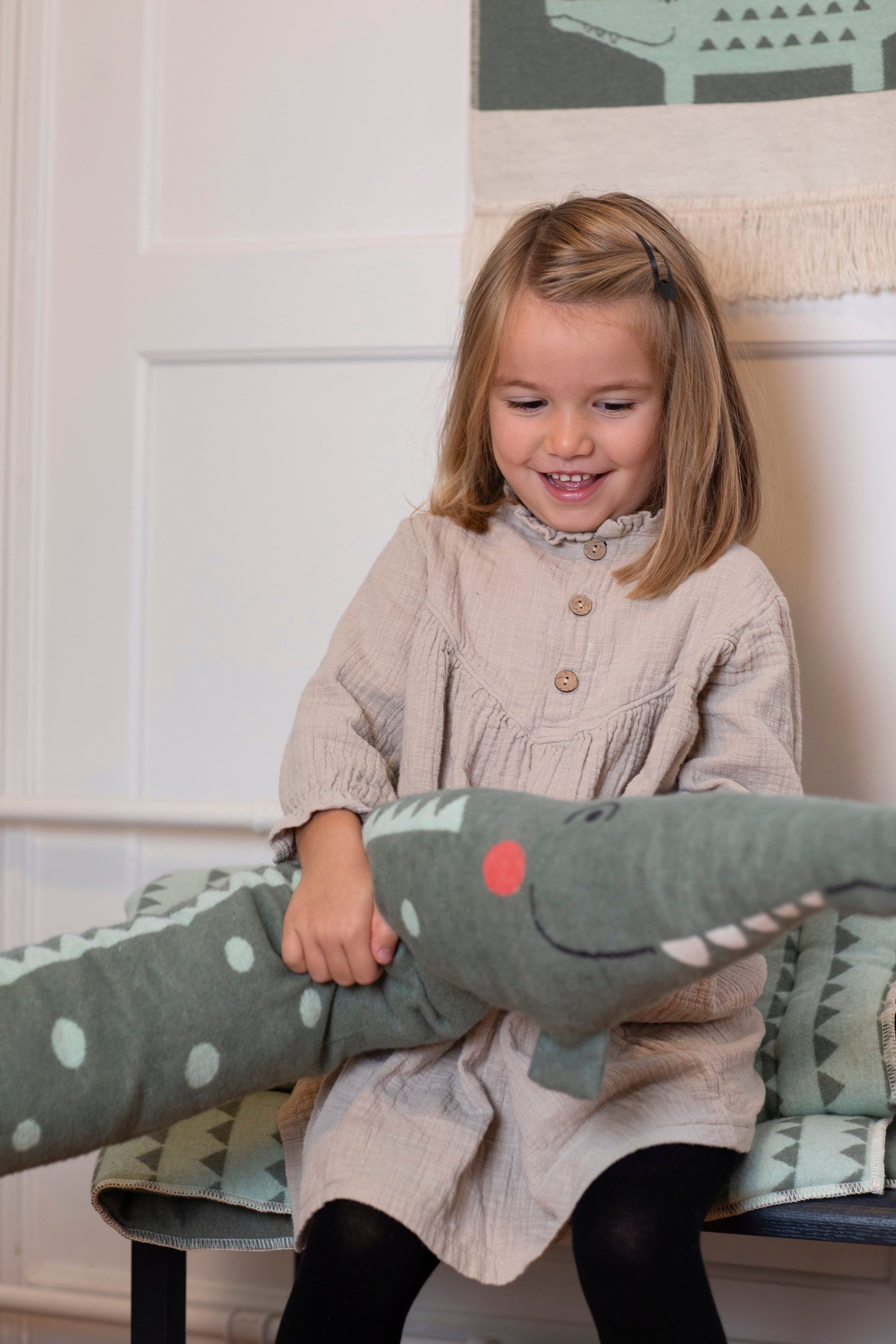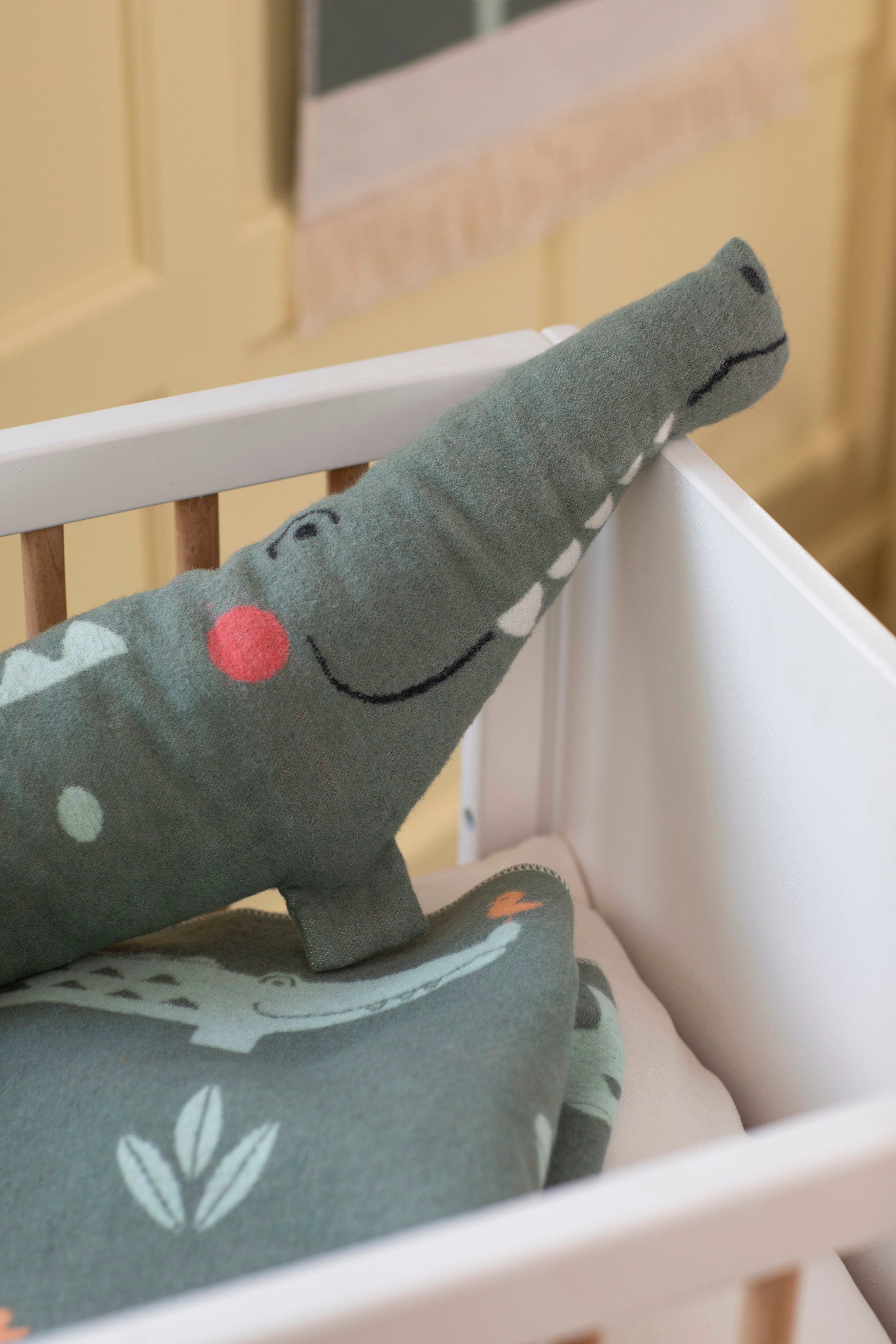Questo cuscino sottile e lungo a forma di coccodrillo è meravigliosamente morbido e perfetto come paracolpi per il lettino, come cuscino morbido o anche come nido per i più piccoli. Colpisce per il suo design giocoso e offre sicurezza e comfort.