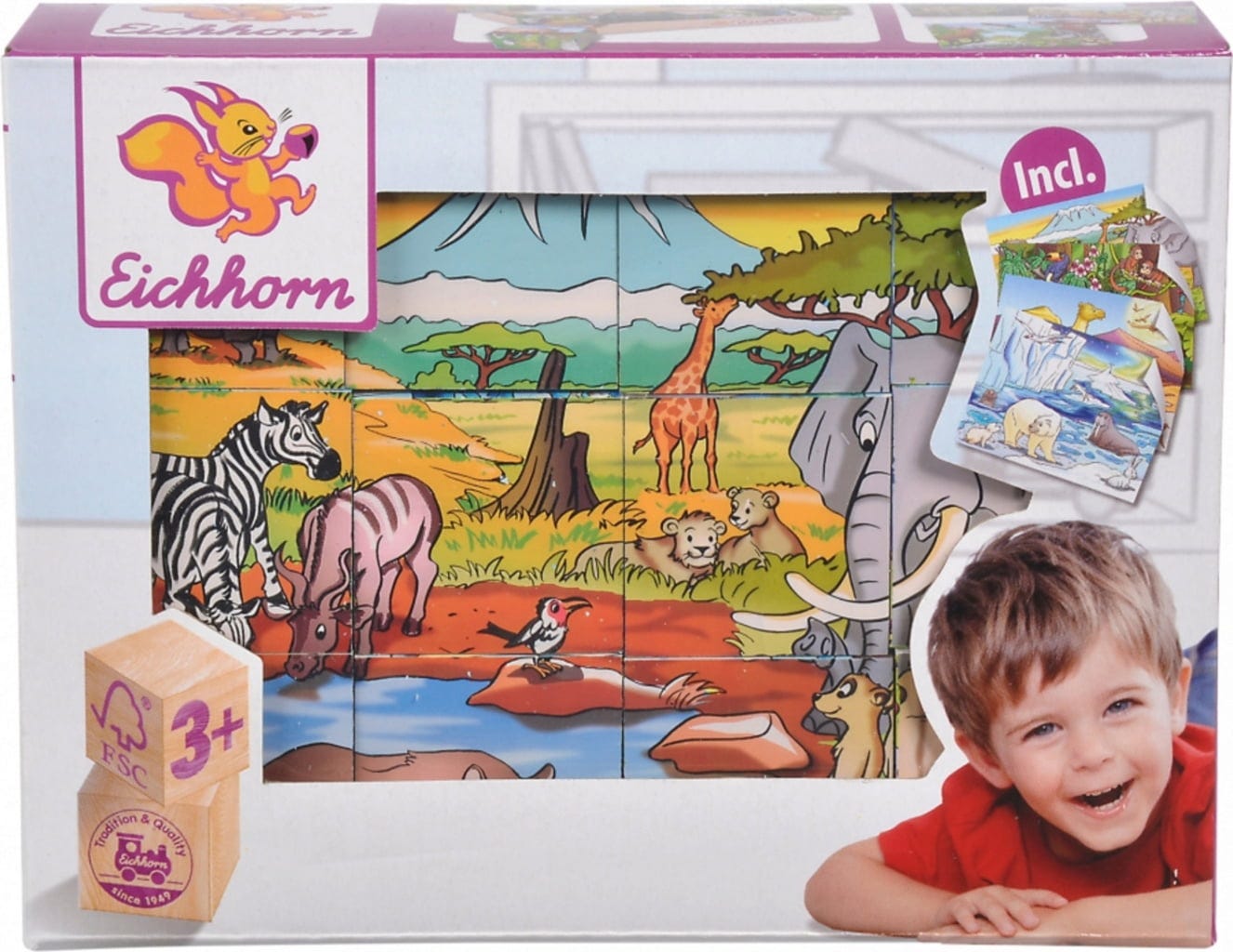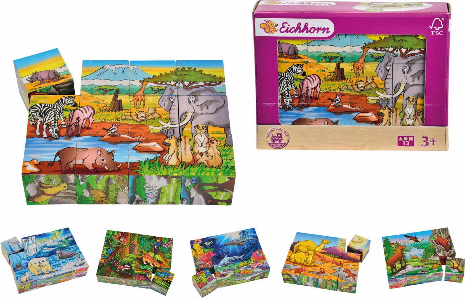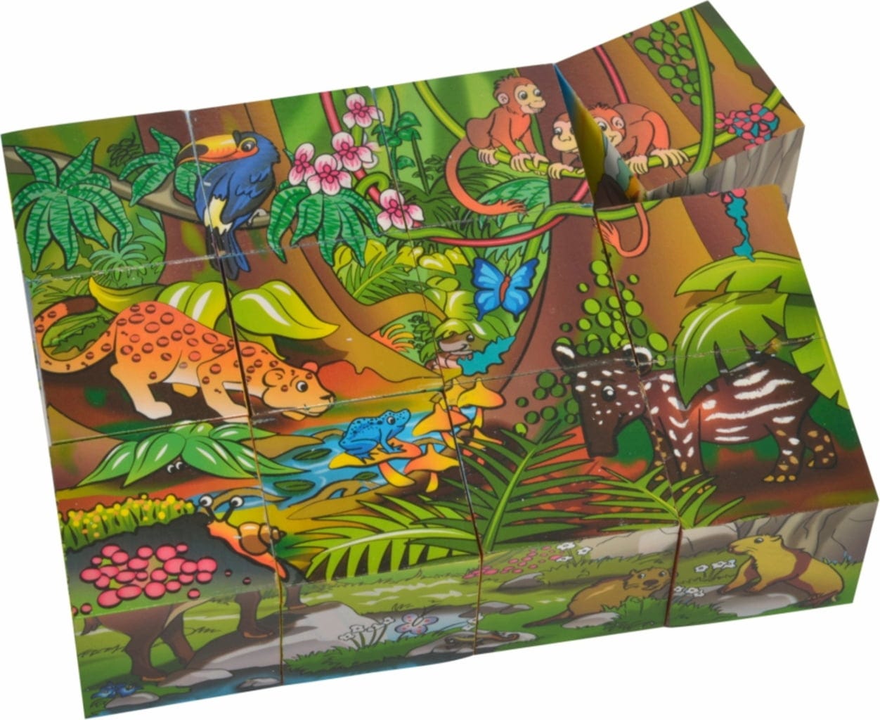 I 12 cubi di legno dai colori vivaci possono essere disposti in modo da formare sei immagini colorate raffiguranti, tra le altre cose, abitanti della giungla esotici, fauna africana e fantasiose scene subacquee. Grazie ai fogli con i disegni da usare come guida, l'assemblaggio delle immagini è facile e divertente, anche per i più piccoli.