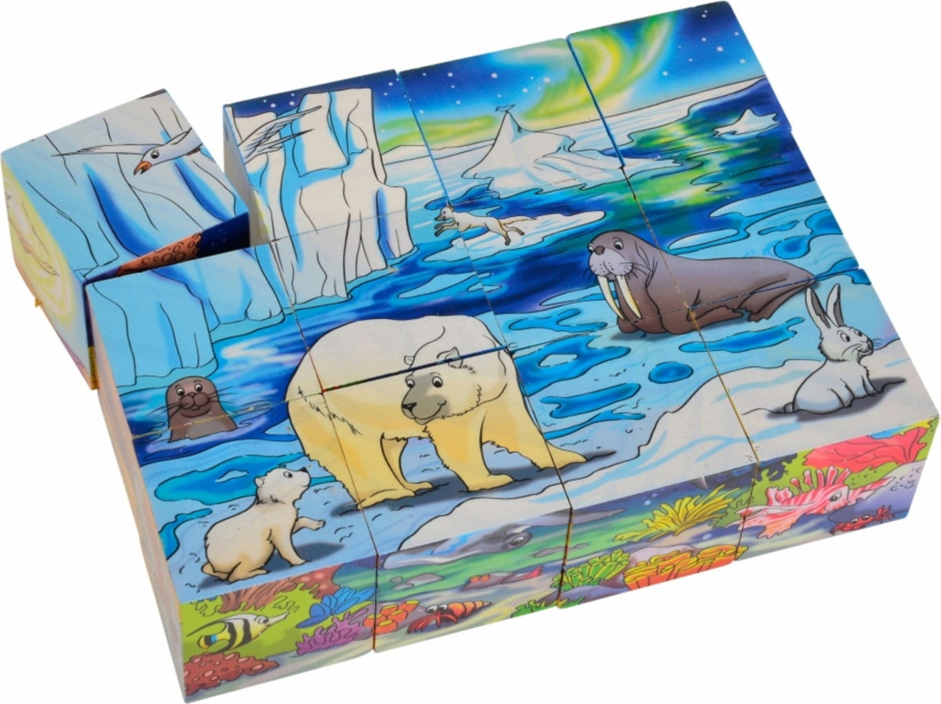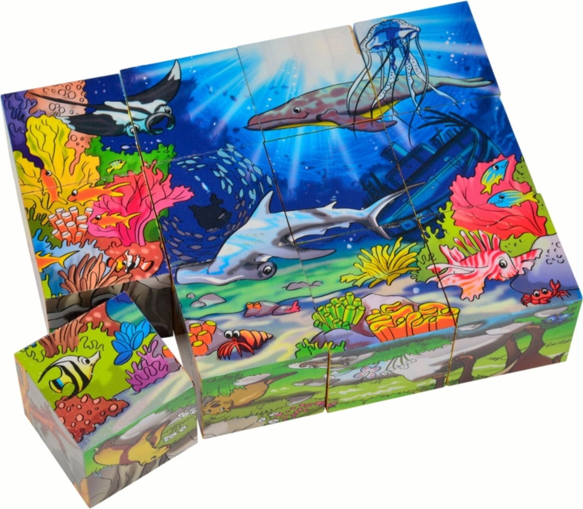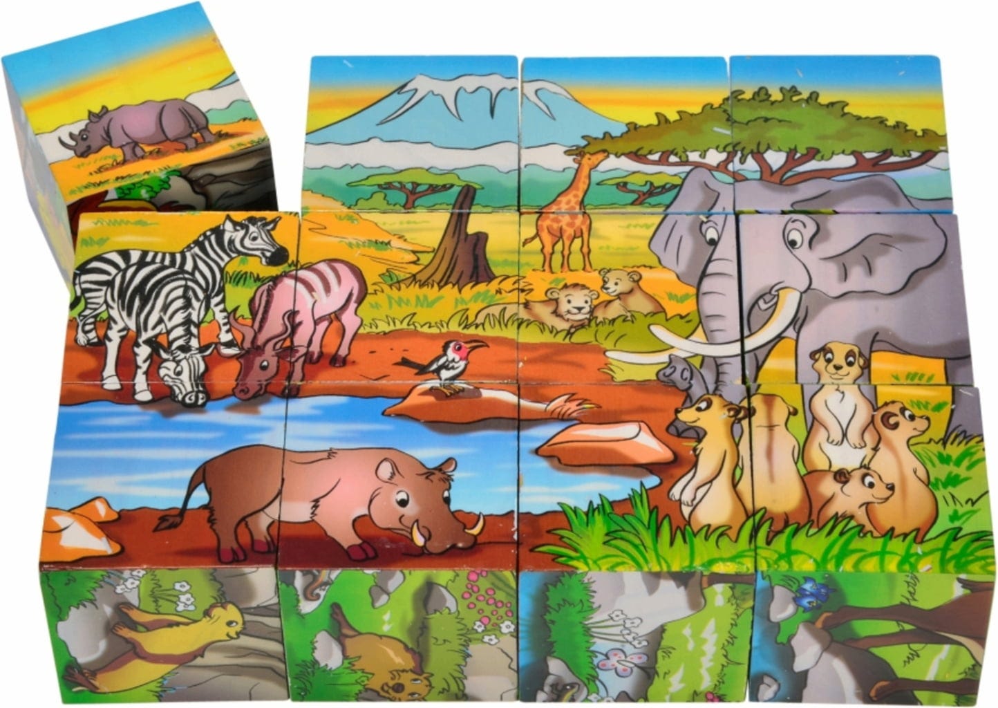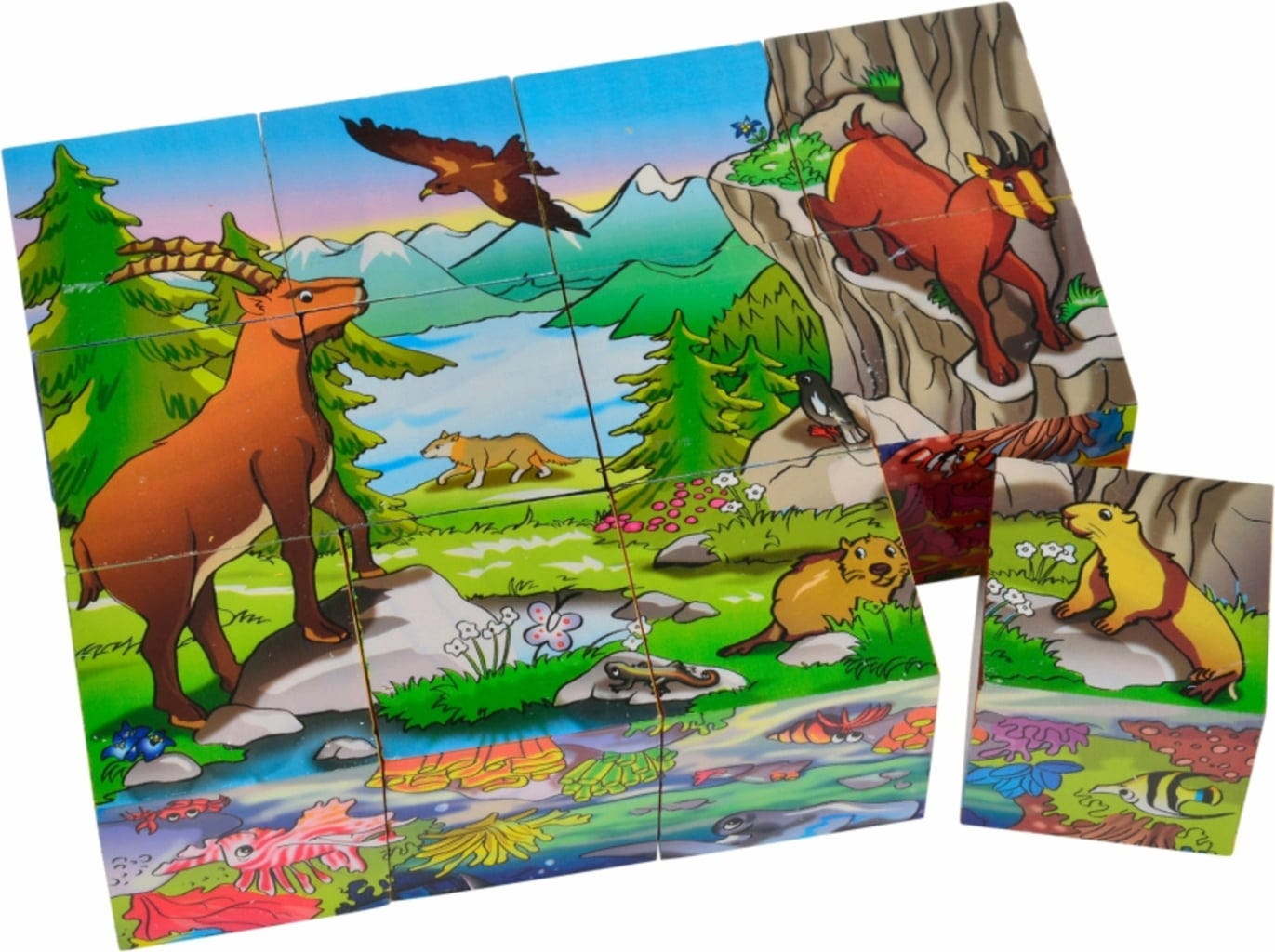 I 12 cubi di legno dai colori vivaci possono essere disposti in modo da formare sei immagini colorate raffiguranti, tra le altre cose, abitanti della giungla esotici, fauna africana e fantasiose scene subacquee. Grazie ai fogli con i disegni da usare come guida, l'assemblaggio delle immagini è facile e divertente, anche per i più piccoli.
