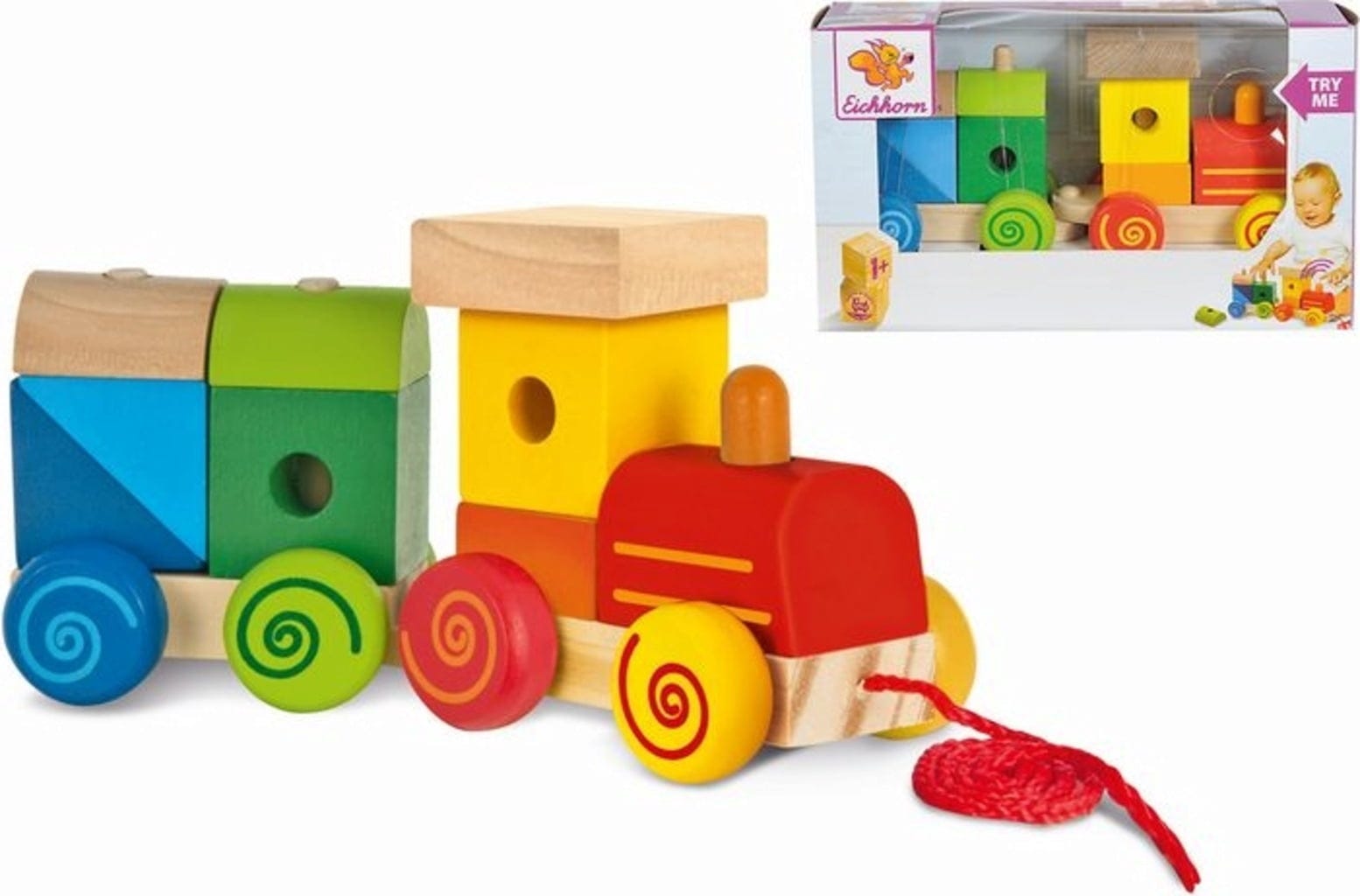 Arriva il coloratissimo treno di EICHHORN! È composto da 11 pezzi resistenti in legno e, grazie alla cordicella rossa, si lascia tirare facilmente dai bambini. Ha anche un'emozionante funzione sonora.