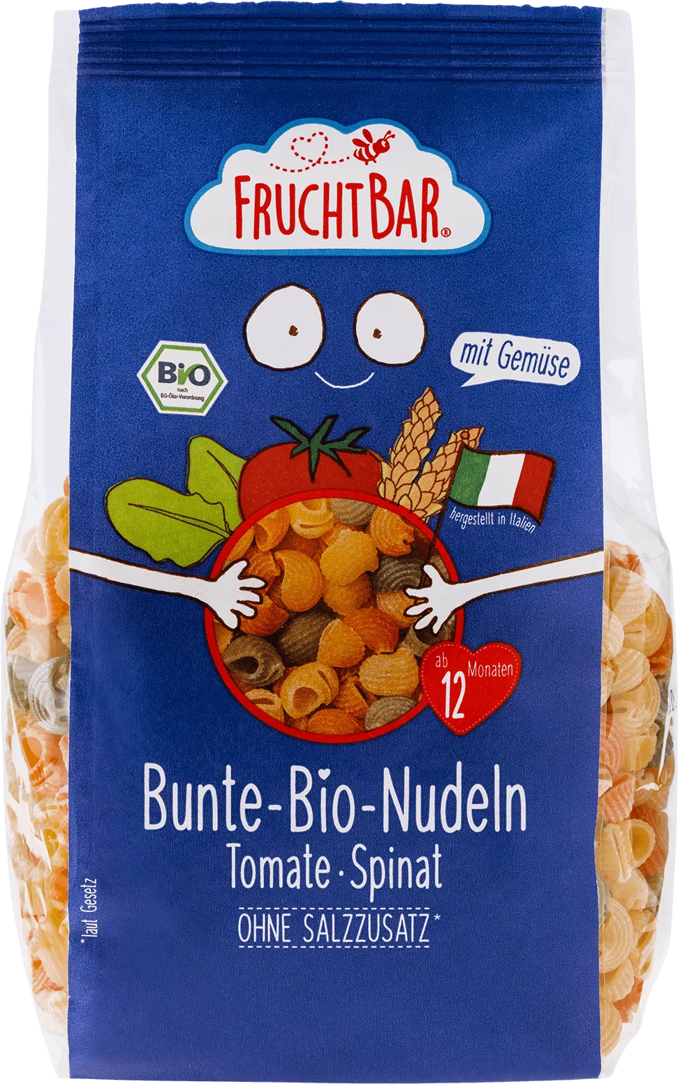 La pasta è sempre uno dei piatti preferiti dei bambini ed è anche molto veloce e facile da preparare. Questa pasta di grano duro è colorata con pomodori e spinaci e rende il pasto ancora più divertente. La cottura è di 7-9 minuti in base alla consistenza preferita. Non resta che condire con un sugo a scelta e... buon appetito!