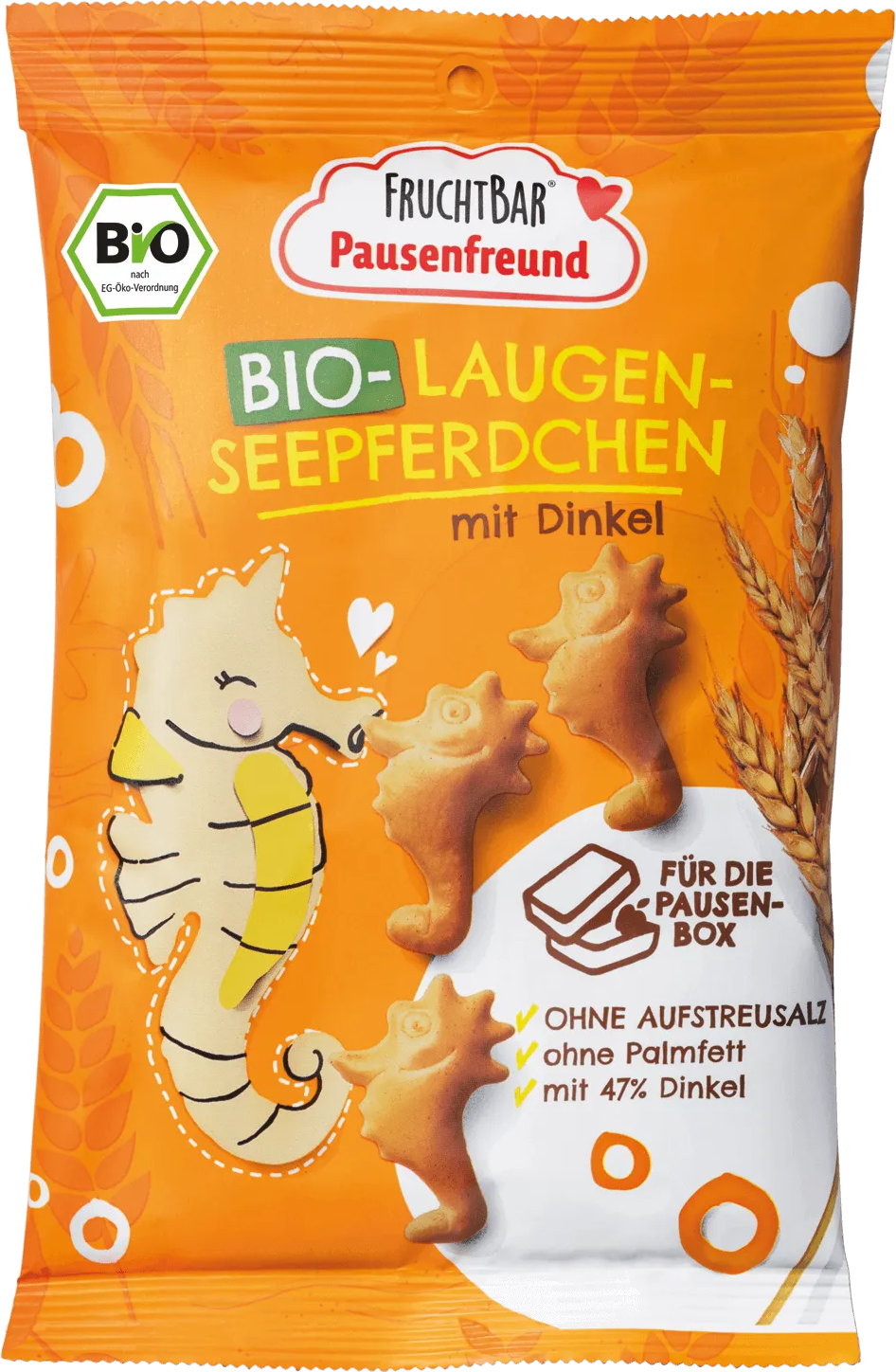 La linea Pausenfreund di FRUCHTBAR è pensata per la merenda dei più piccoli e include snack dolci e salati perfetti da portare con sé, all'asilo, al parco o in viaggio, ma anche da gustare a casa. Questi salatini a forma di cavalluccio marino non sono solamente divertenti e bellissimi, ma hanno anche un sapore gustoso e una consistenza meravigliosamente croccante.