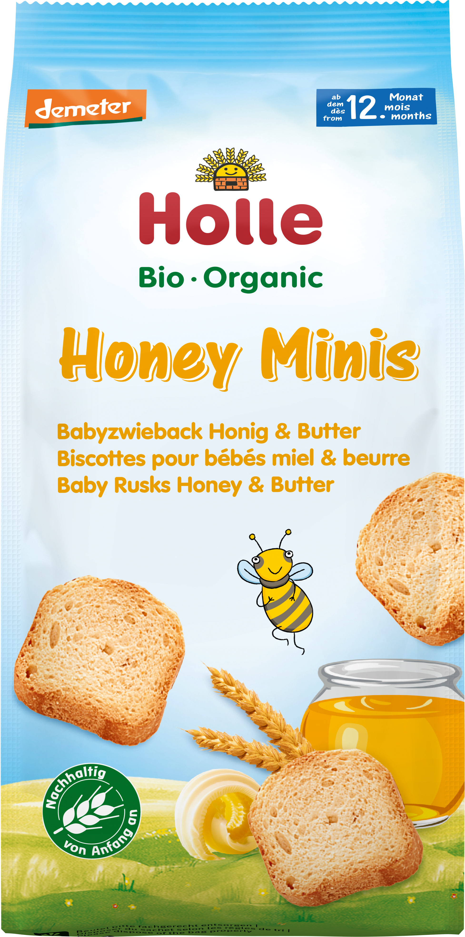 Deliziose fette biscottate con miele e burro in un pratico formato mini. Ideali a partire dal 12° mese per allenare la masticazione, per preparare un gustoso porridge di fette biscottate o come merenda anche per i più grandicelli Le fette biscottate sono prodotte con ingredienti provenienti da coltivazione Demeter e da agricoltura biologica. Senza conservanti, aromi e coloranti artificiali.