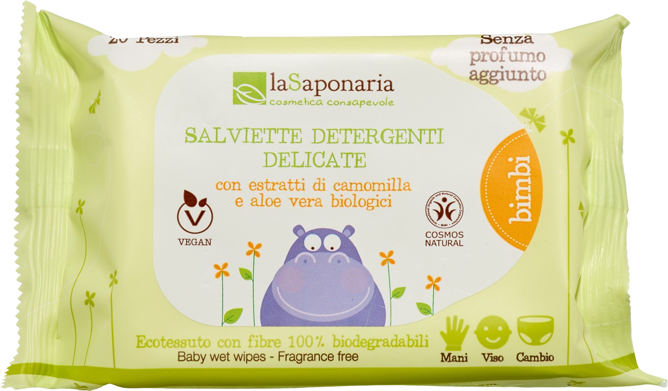 Le salviette umidificate de La Saponaria sono realizzate con un morbidissimo tessuto 100% biodegradabile e sono imbevute con una lozione di ingredienti vegetali ed estratti biologici.