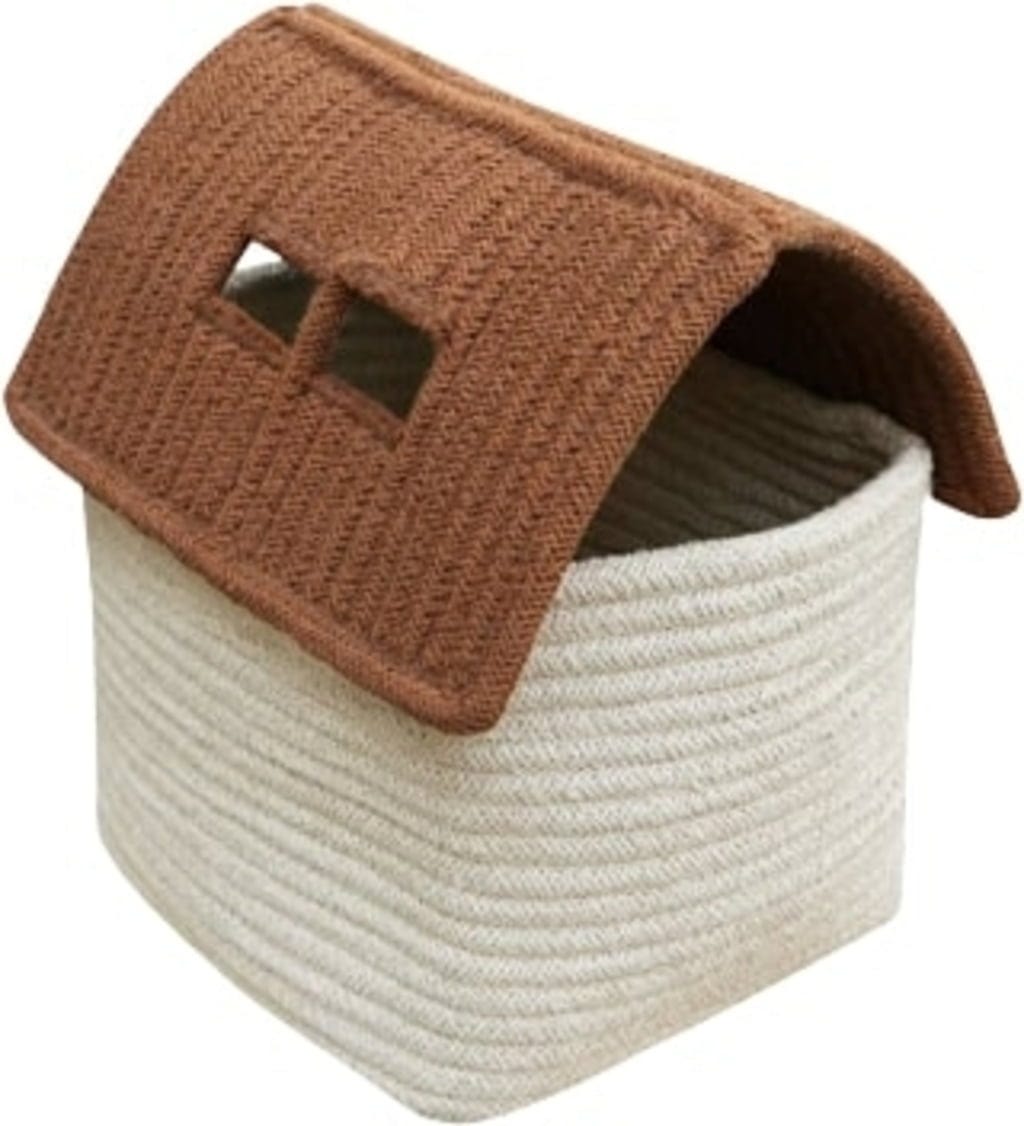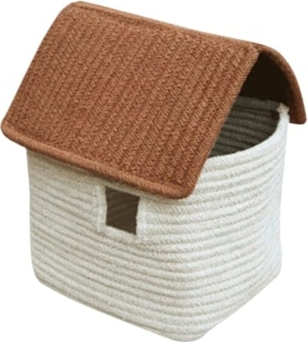 Sono fatti di corde di cotone spesse intrecciate che vengono tradizionalmente lavorate a mano, prestando attenzione a piccoli dettagli come le finestre e il grazioso tetto a due falde, mentre per i colori tenui vengono utilizzate solo tinture naturali. L'apertura triangolare consente di riporre gli oggetti all'interno del cestino. In questo modo, anche riordinare può essere divertente!
