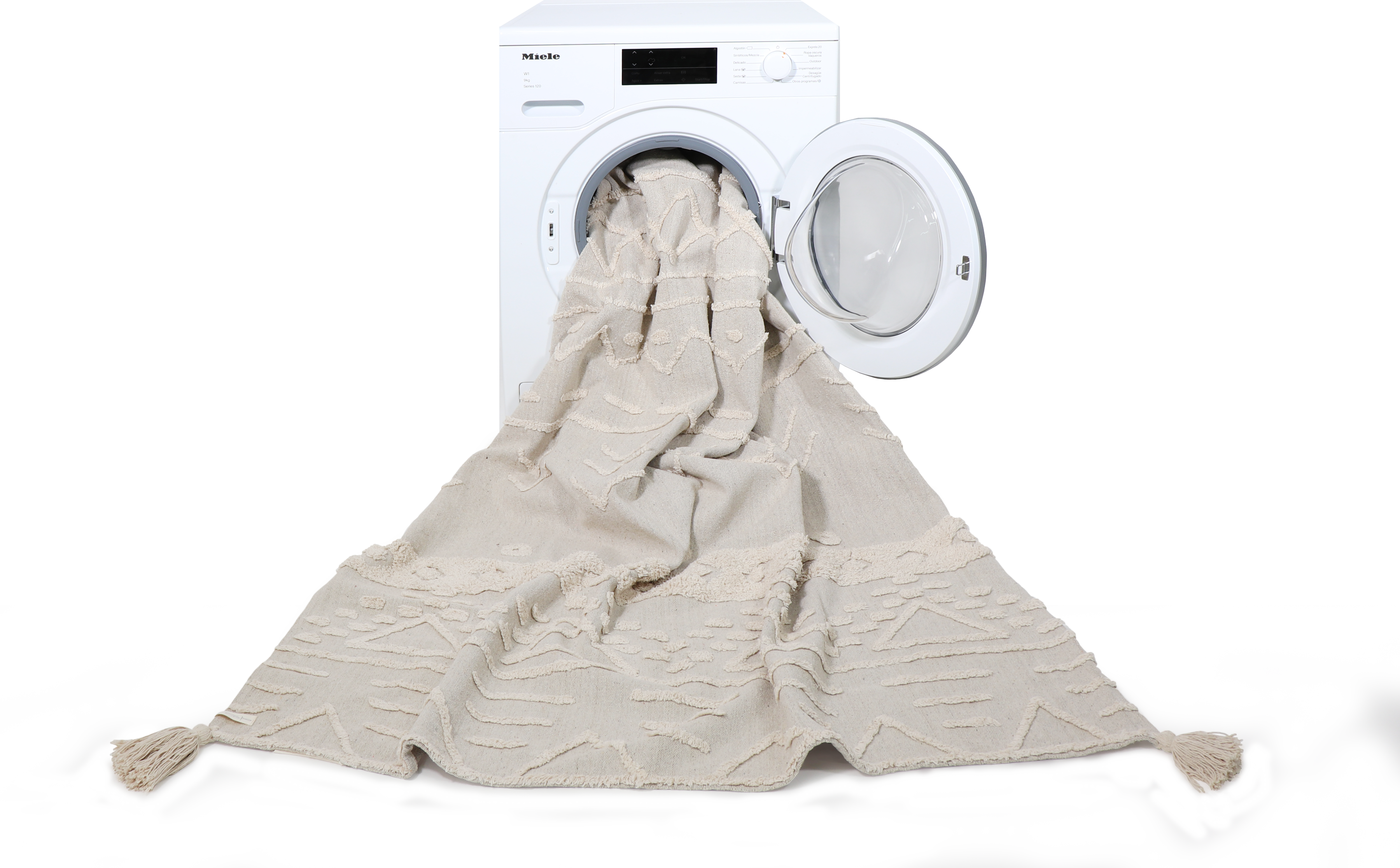 Il tappeto in cotone "Tribu" di Lorena Canals è una raffinata composizione dal design innovativo. Ogni angolo è rifinito con una nappa - un segno distintivo dei tappeti di epoche passate, specialmente in Oriente. Il cotone riciclato è stato utilizzato per la base sul lato inferiore.