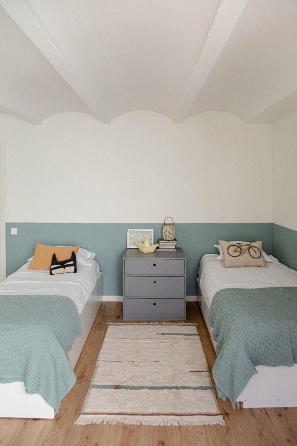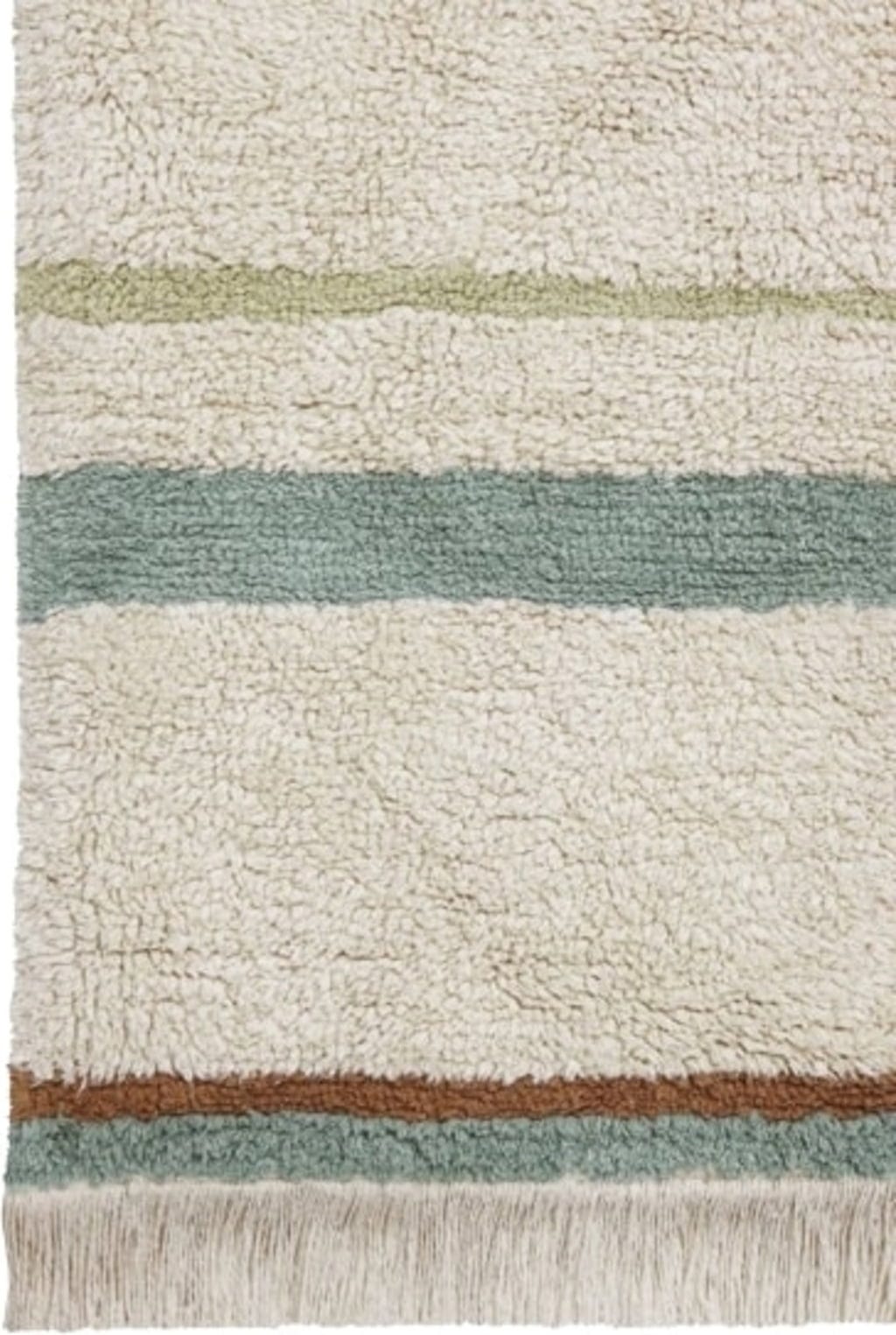 Colori tenui perfettamente abbinati e un motivo che si basa sull'interazione di linee strette e larghe fanno di questo tappeto, realizzato a mano e colorato con coloranti naturali, un meraviglioso accessorio per soggiorni, camere da letto e camerette.