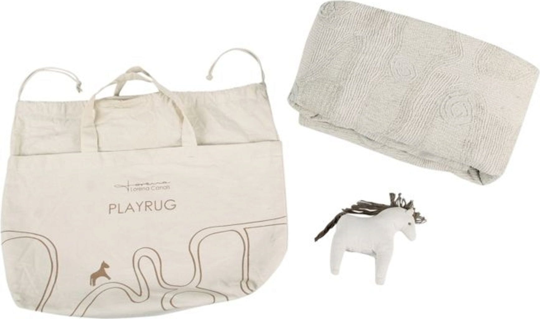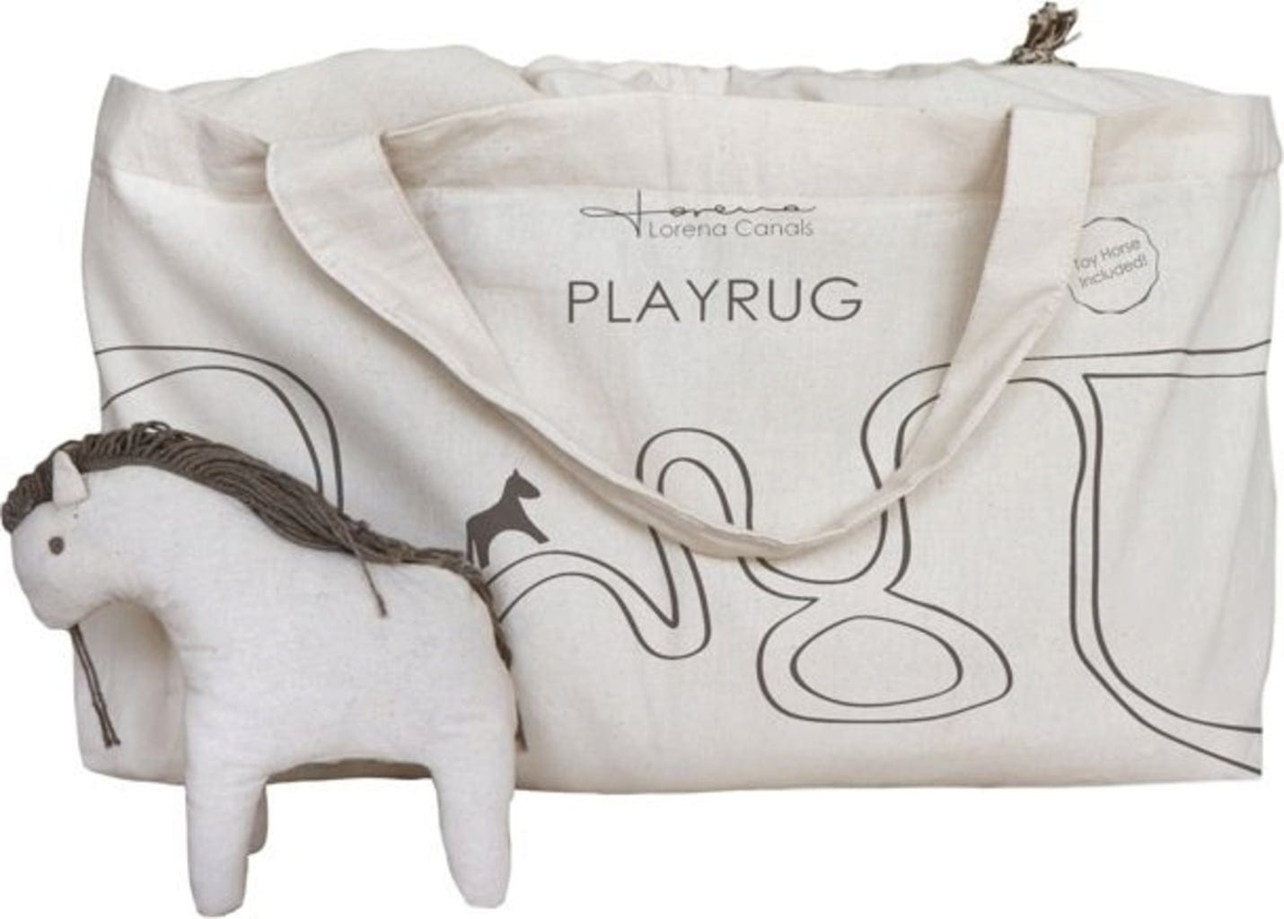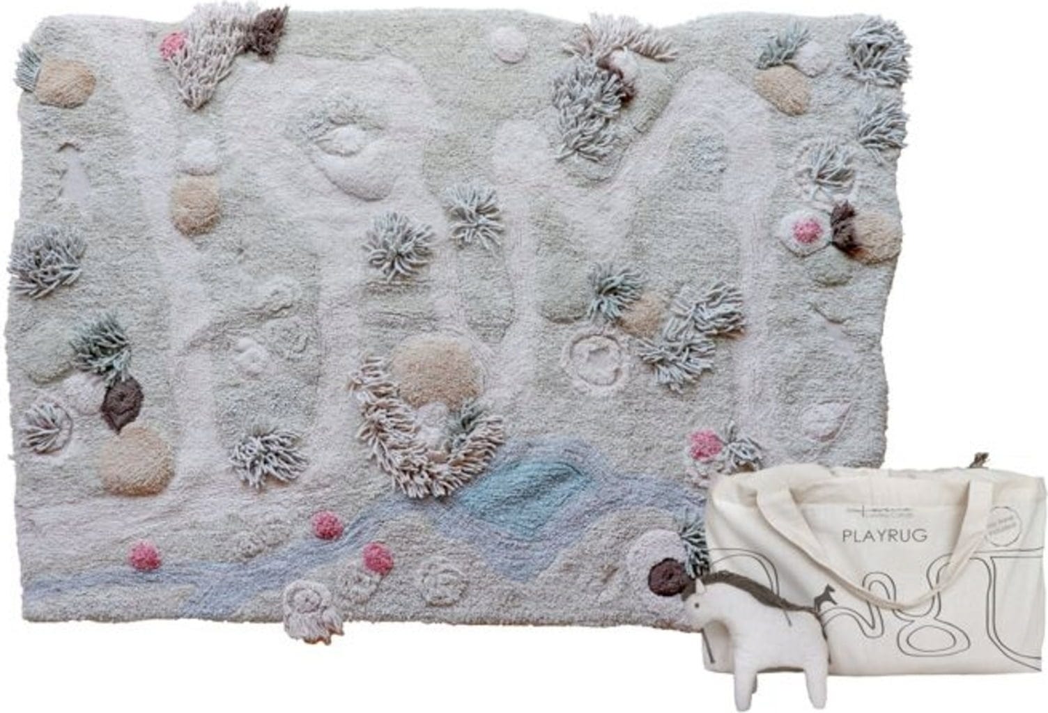 Con questo fantastico tappeto, i pomeriggi di noia e tristezza saranno solo un lontano ricordo! Il tappeto rappresenta una piccola mappa con fiumi e boschi tutti da esplorare con il cavallo di peluche.