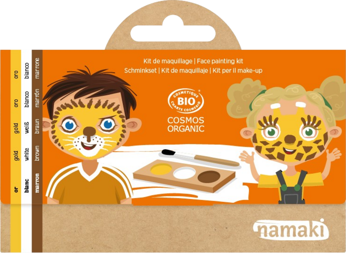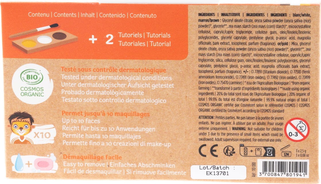 Leone o giraffa? I tre colori - bianco, marrone e oro - possono essere utilizzati per trasformarsi in entrambi gli animali. Le formulazioni naturali dei colori per il trucco sono ipoallergeniche e delicate sulla pelle e possono essere facilmente eliminate.