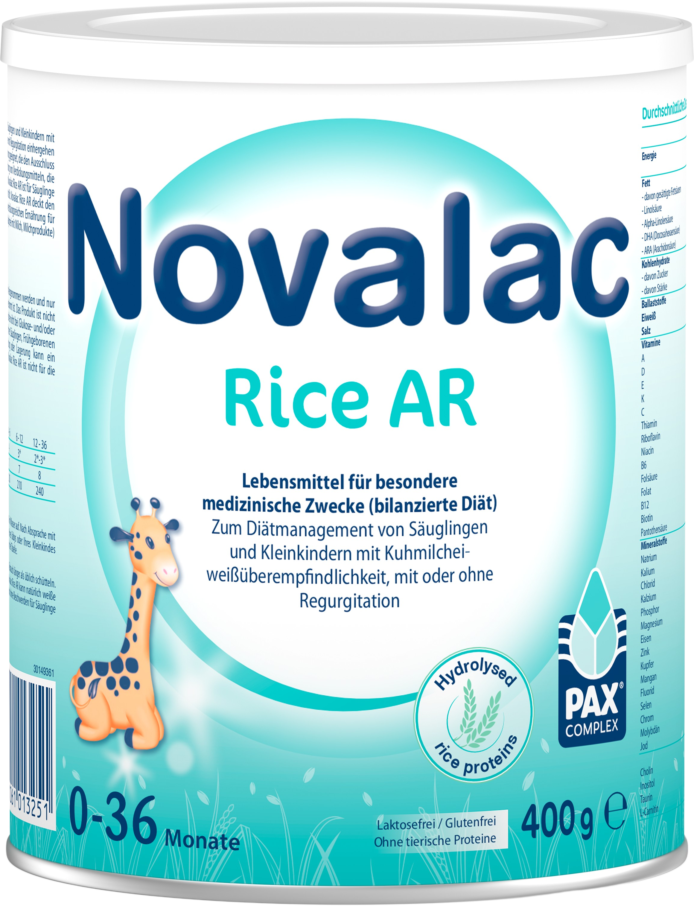 Novalac Rice AR contiene proteine di riso idrolizzate ed è adatto a neonati e bambini con allergie alle proteine del latte vaccino. La ricetta Novalac Rice AR non contiene proteine animali ed è priva di lattosio, glutine e soia. Può essere utilizzato come alimento unico per i primi 6 mesi e successivamente nell'ambito di una dieta mista.