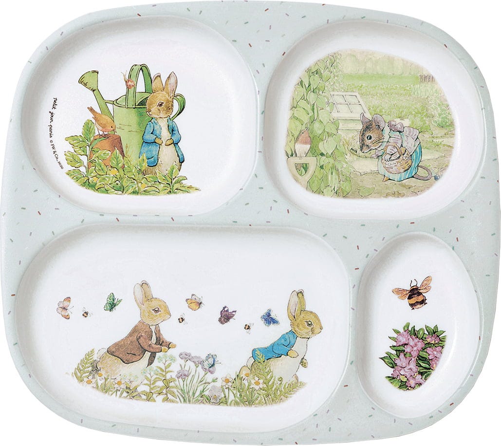 Der Brei will zum Mäuschen, zu den Hasen kommt Fleisch und Gemüse, leckeres Obst für die Biene - hier hat jedes Gericht seinen Platz, um den Kleinsten ein ausgewogenes Mini-Buffet bieten zu können. Spülmaschinenfest und verziert mit den niedlichen Figuren aus der Welt von Peter Hase.