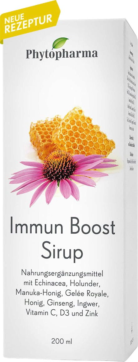 Der Immun Boost Sirup von Phytopharma enthält unter anderem Echinacea, Holunder, Manuka-Honig, Gelée Royal, Ginseng, Ingwer, Zink, Vitamin C und Vitamin D3. Der Sirup ist auch für Kinder ab 3 Jahren geeignet.