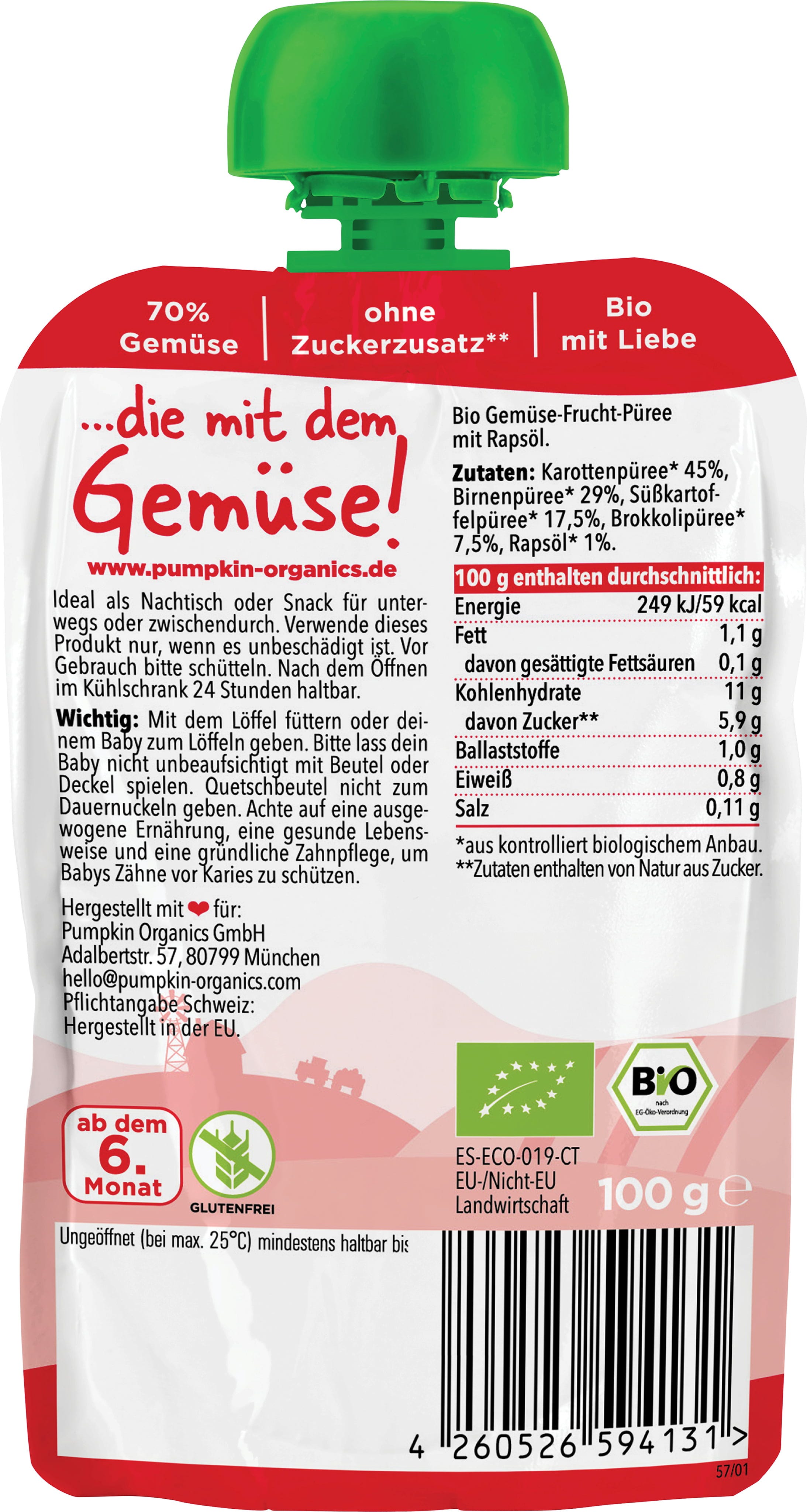 Pumpkin Organics Mousse da Spremere Bio - Carota, Pera, Patata Dolce e Broccoli, 100 g
