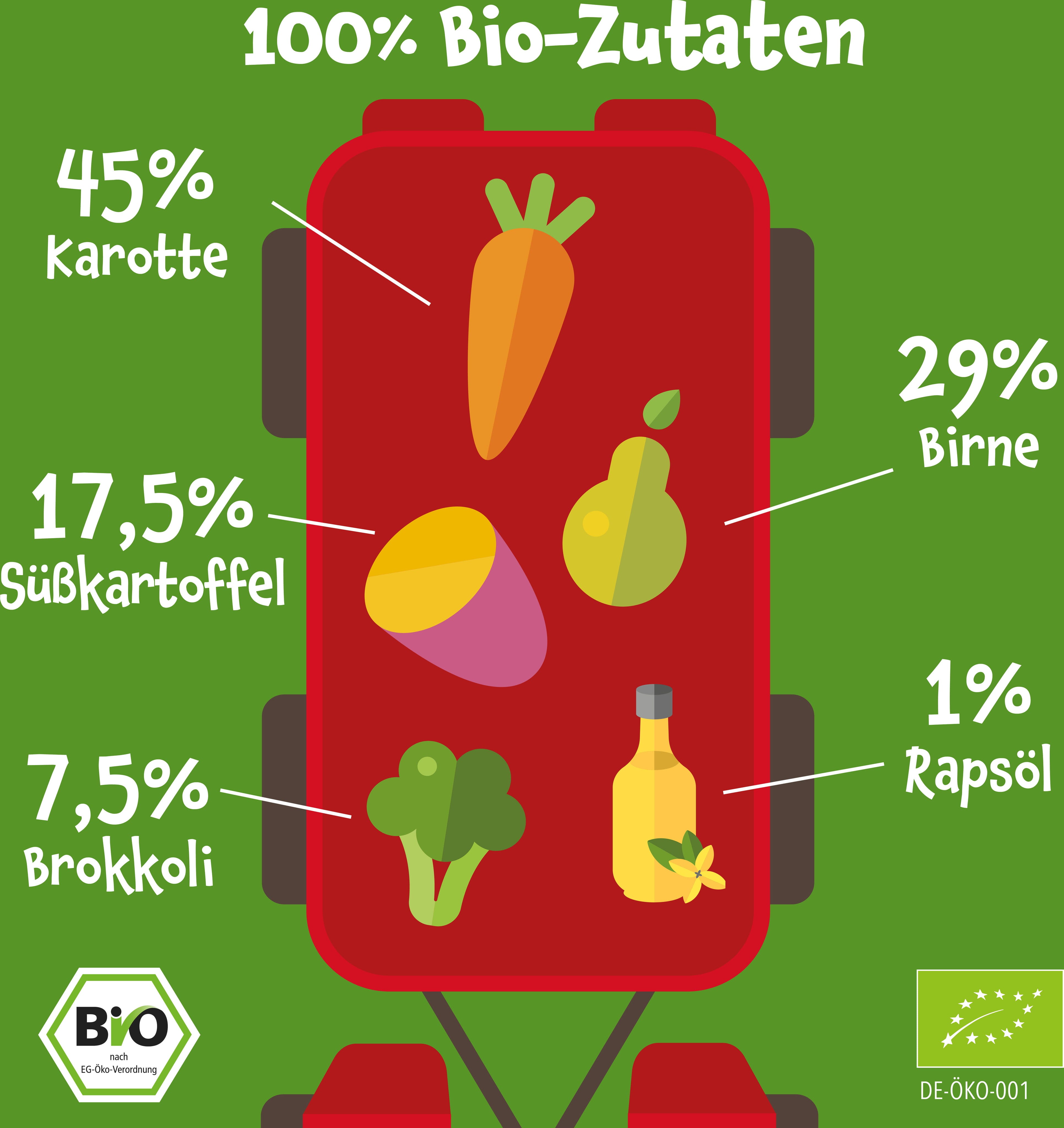 Questa busta da spremere contiene una succosa purea a base di frutta e verdura bio selezionate. La ricetta è ottimizzata con prezioso olio di colza. Un pratico spuntino da portare sempre con sé per bambini dai 6 mesi in su. Senza zuccheri aggiunti o additivi.