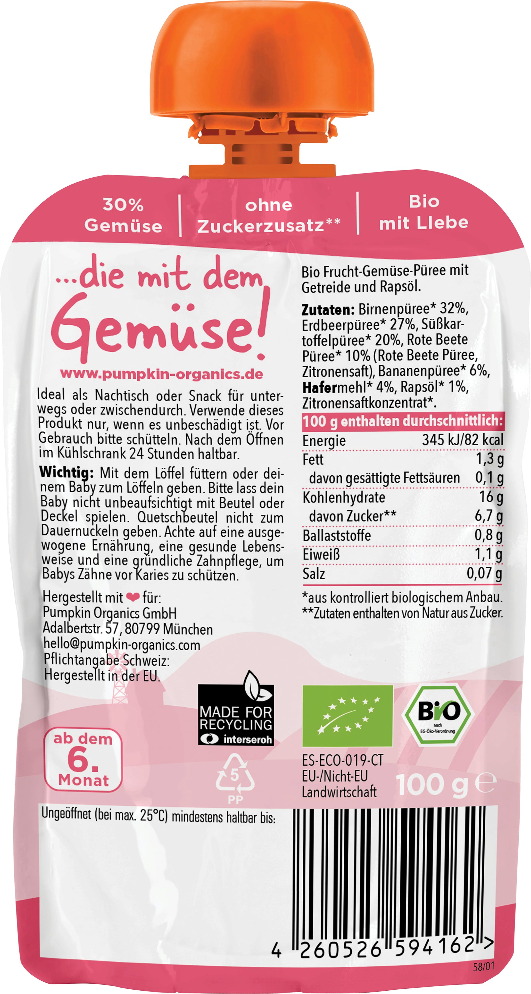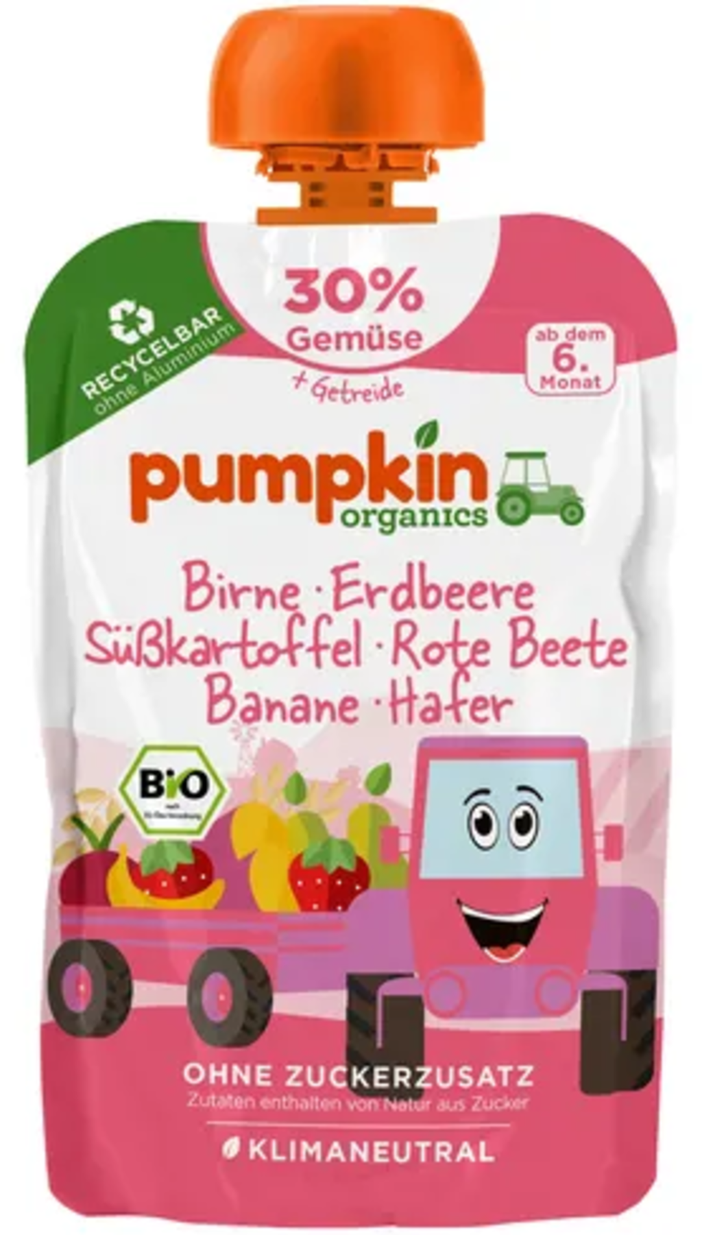Pumpkin Organics Mousse da Spremere Bio - Pera, Fragola, Patata Dolce, Barbabietola, Banana e Avena, 100 g