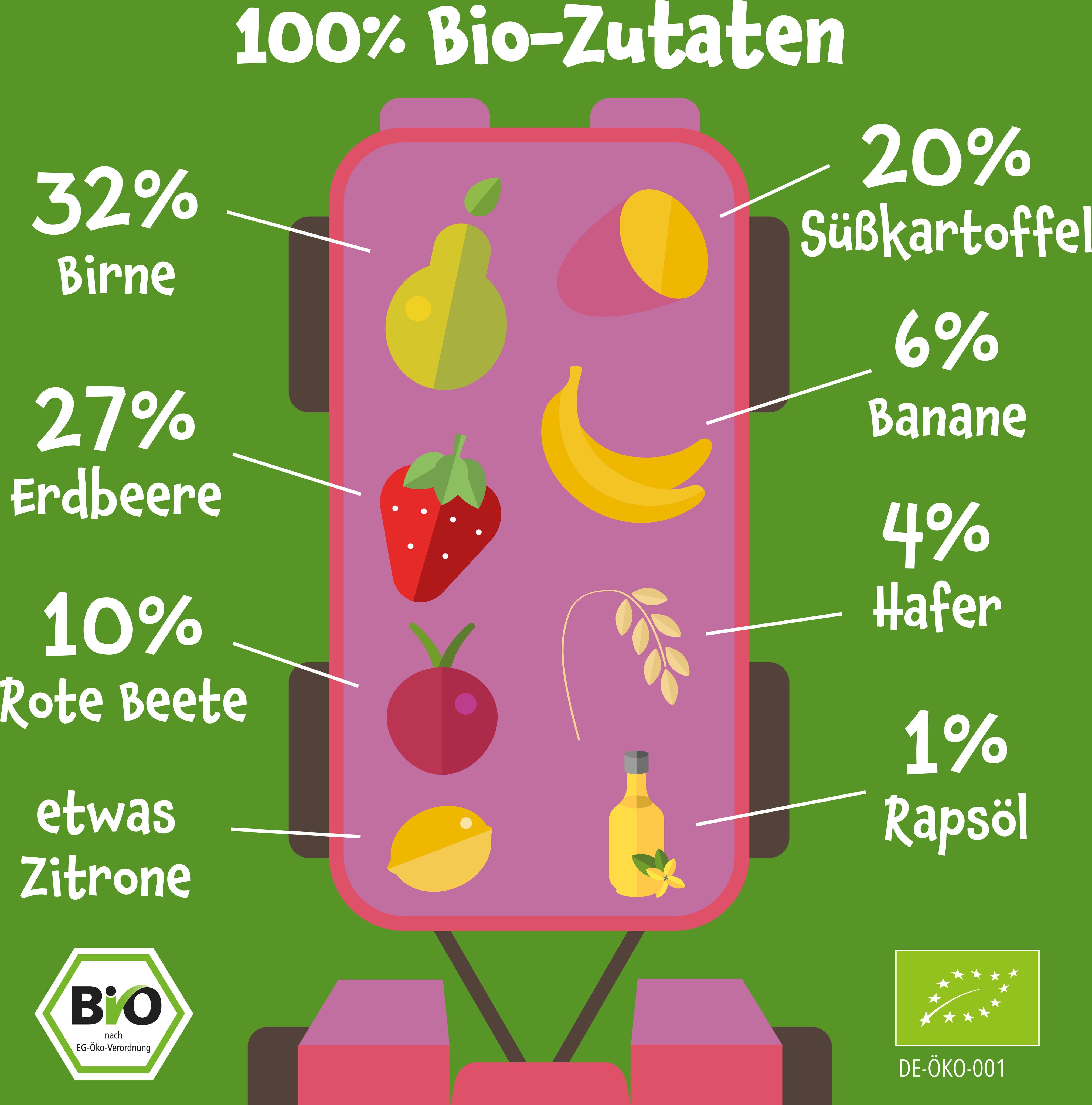 Questa busta da spremere contiene una succosa purea a base di frutta e ortaggi bio selezionati, arricchita con avena. La ricetta è arrotondata con un filo d'olio di colza. Un pratico spuntino da portare sempre con sé per bambini dai 6 mesi in su. Senza zuccheri aggiunti o additivi.