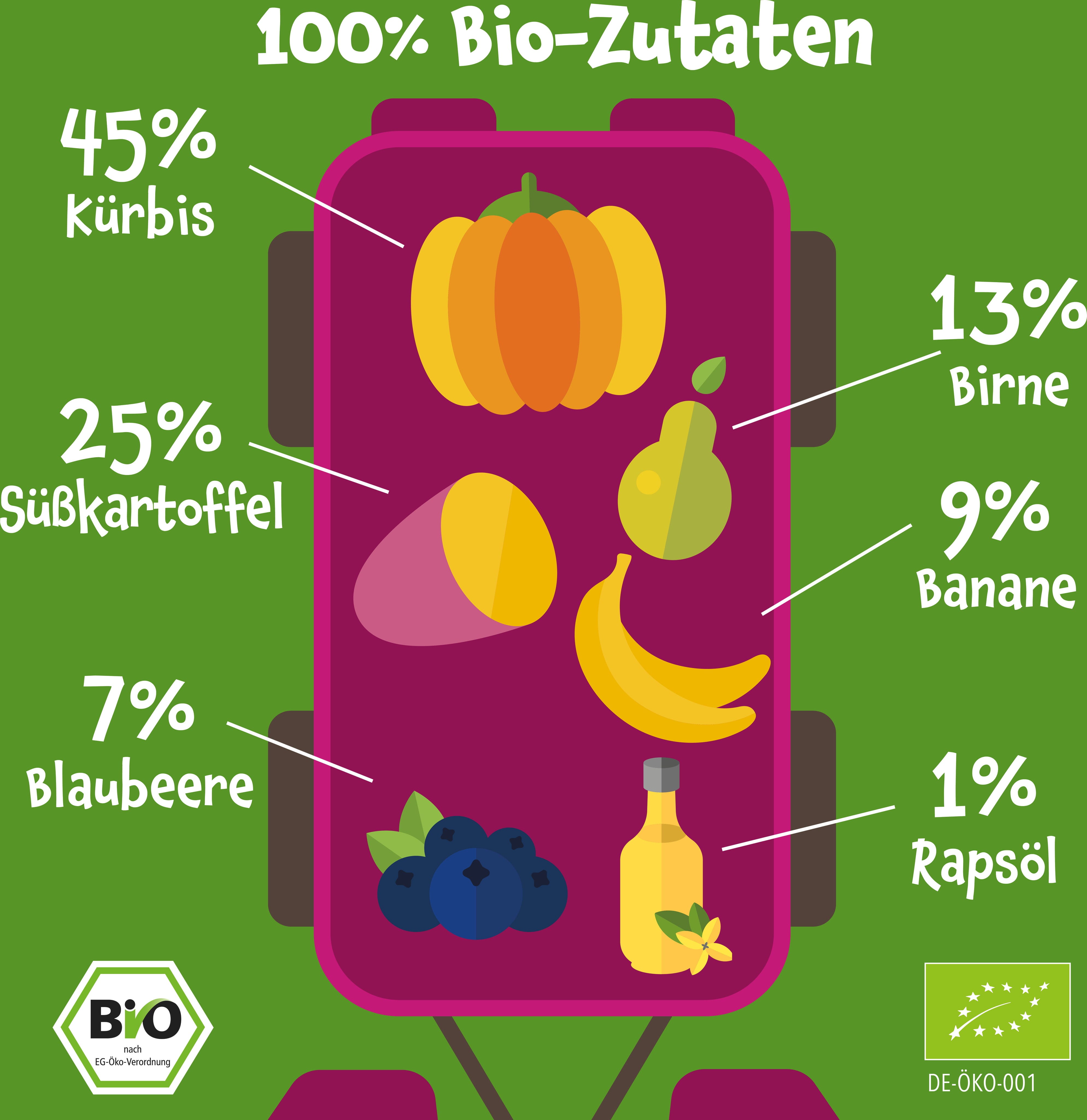 Questa busta da spremere contiene una succosa purea a base di frutta e verdura bio selezionate. La ricetta è ottimizzata con prezioso olio di colza. Un pratico spuntino da portare sempre con sé per bambini dai 6 mesi in su. Senza zuccheri aggiunti o additivi.