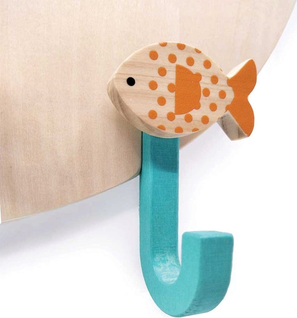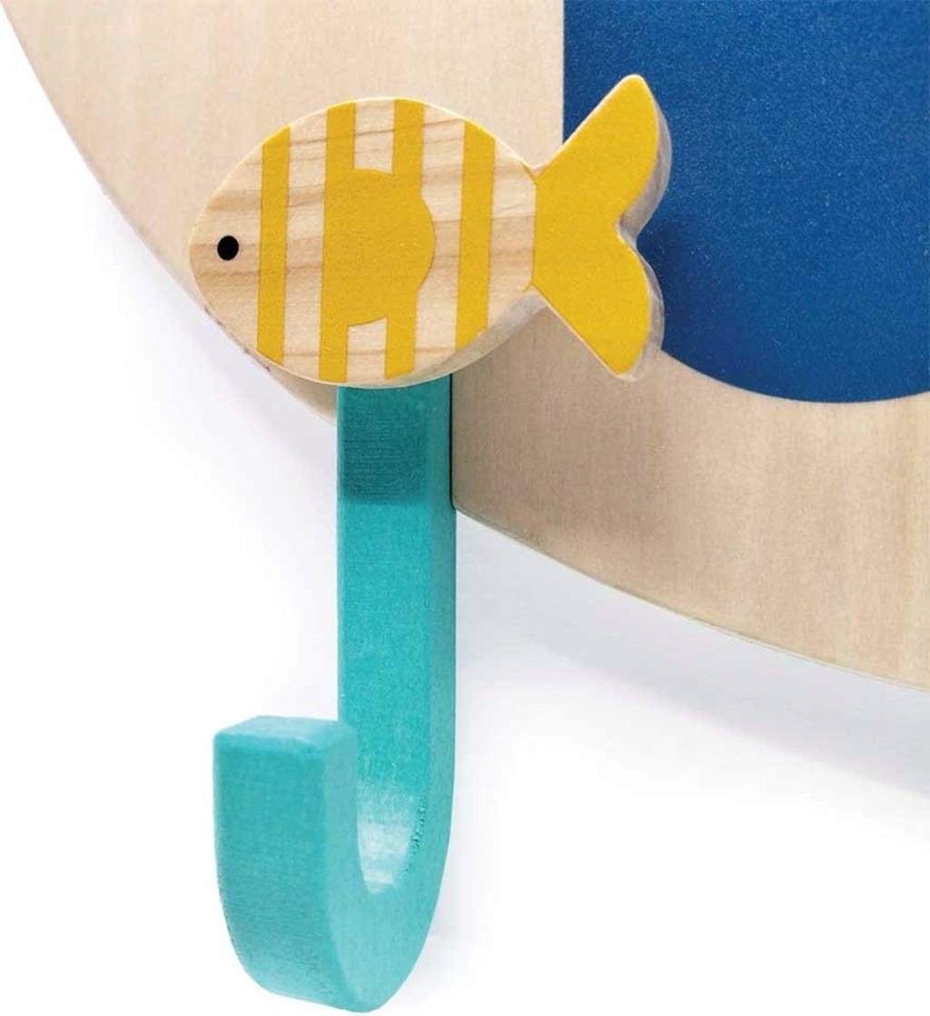 Questa balena fatta di compensato e faggio ha tre piccoli amici pesci al seguito. Ai ganci puoi appendere gilet, giacche e accessori. Dalle forme chiare e dai colori forti, la balena si abbina a qualsiasi arredamento e si fissa al muro in pochi minuti grazie alle viti e tasselli in dotazione.