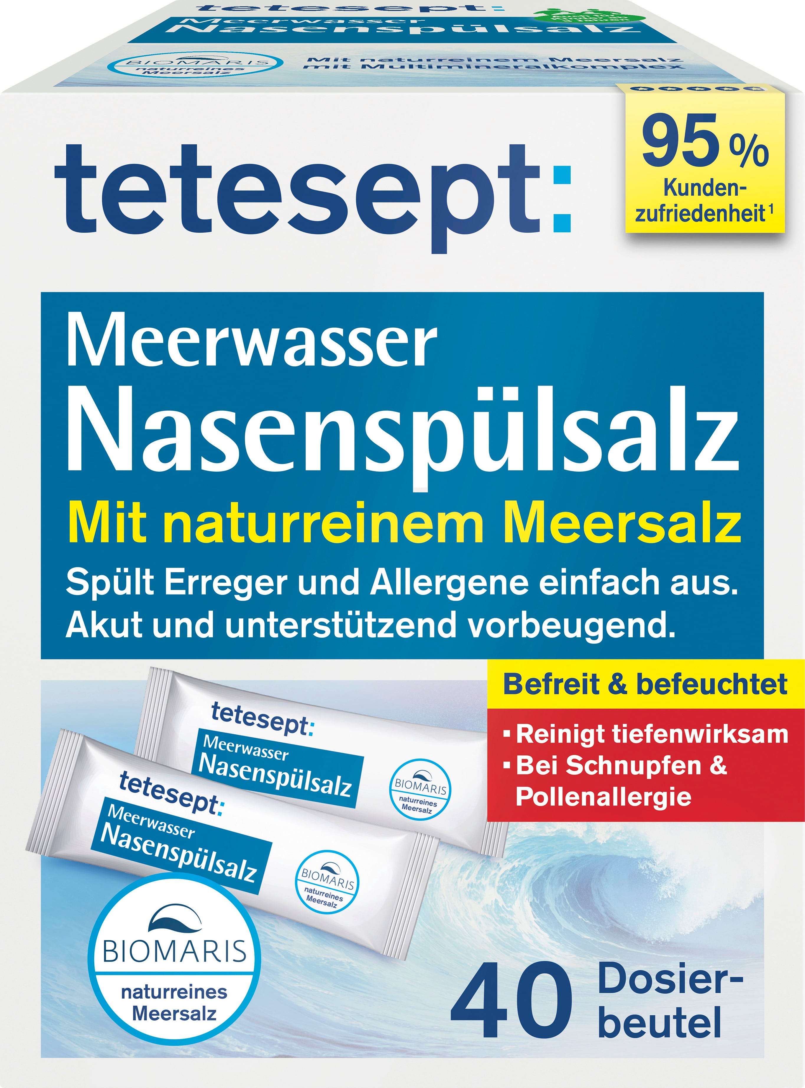 Il sale per lavaggio nasale all'acqua di mare di tetesept contiene puro sale marino naturale ed è pensato per preparare soluzioni saline isotoniche per i lavaggi nasali. La concentrazione di sale corrisponde esattamente a quella del sangue umano, risultando così particolarmente delicata. Ideale per un uso regolare, può essere utilizzato anche dai bambini dai 3 anni in su, sempre sotto supervisione di un adulto. La formulazione è senza conservanti.