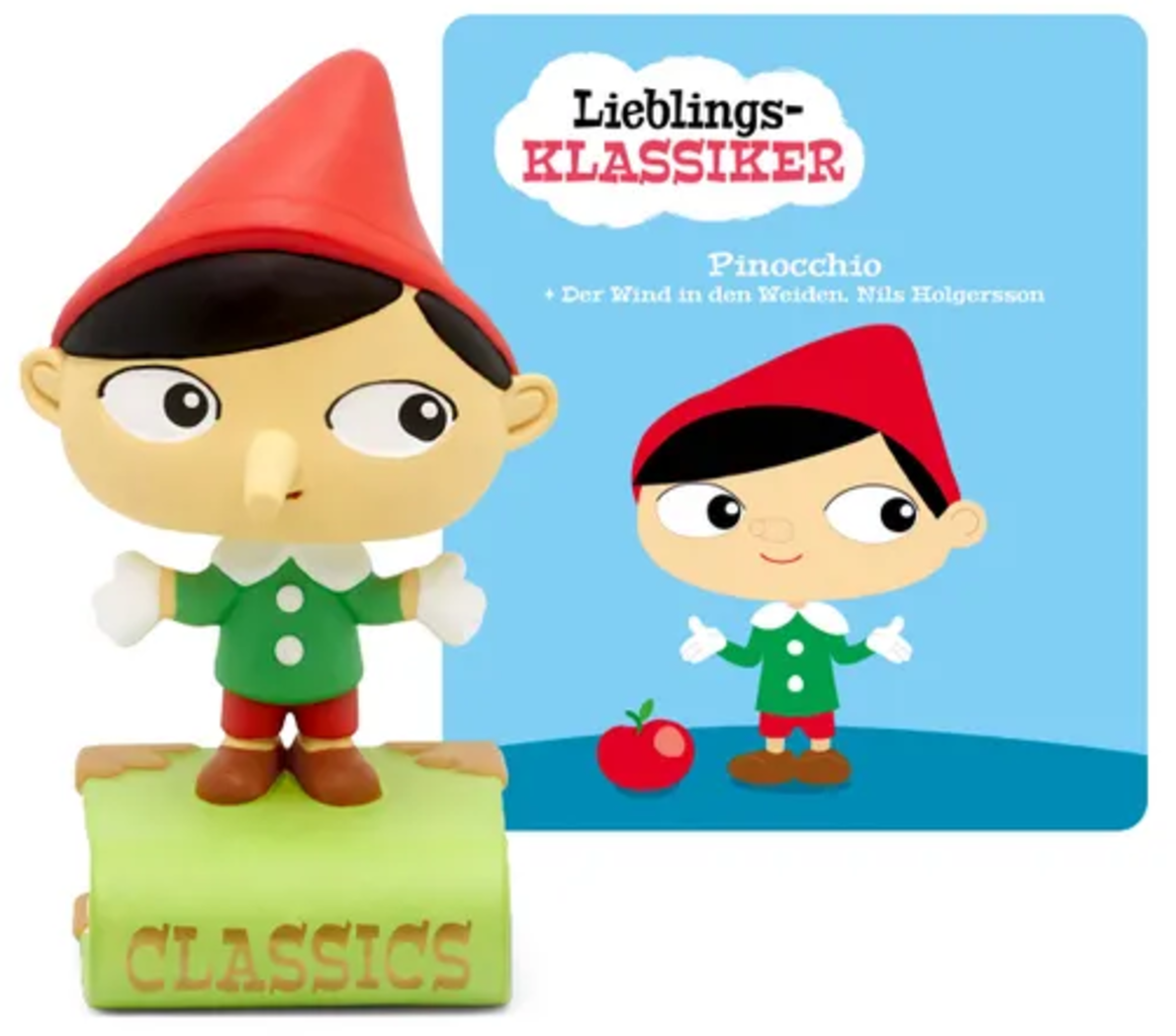 Questo Tonie della serie "Favorite Classics" racconta le storie di "Pinocchio", "Nils Holgersson" e "Il vento tra i salici" in modo divertente per i più piccoli ascoltatori.